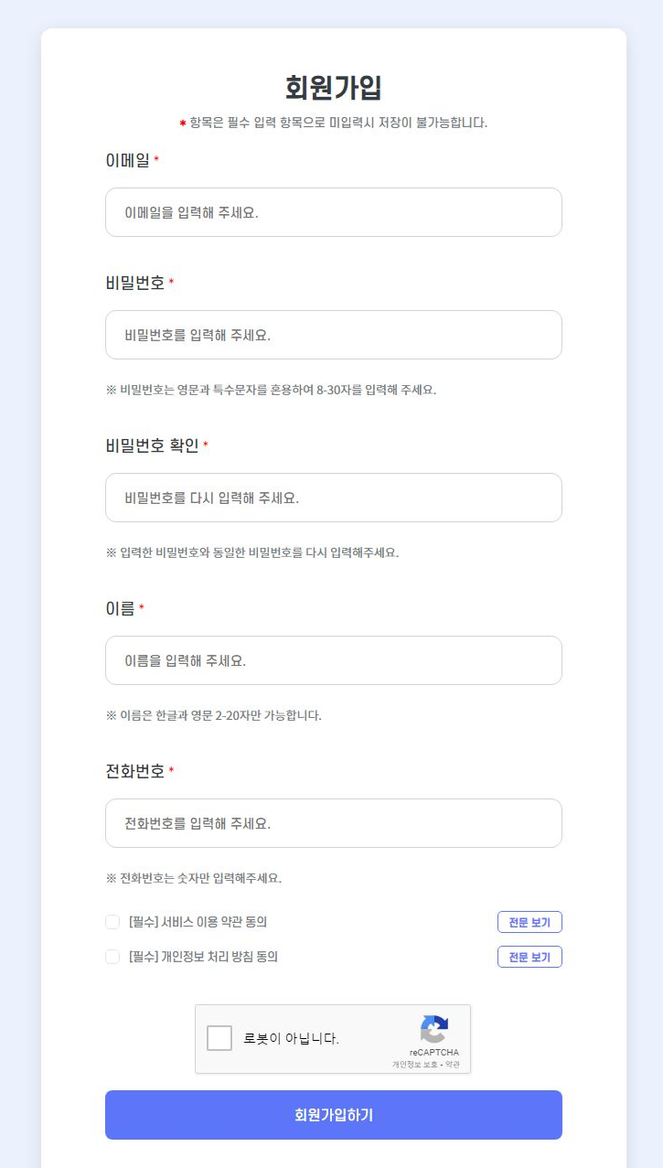 이메일, 비밀번호, 이름, 전화번호를 입력한 후 약관에 동의하시고 "회원가입하기" 버튼을 눌러주세요.
