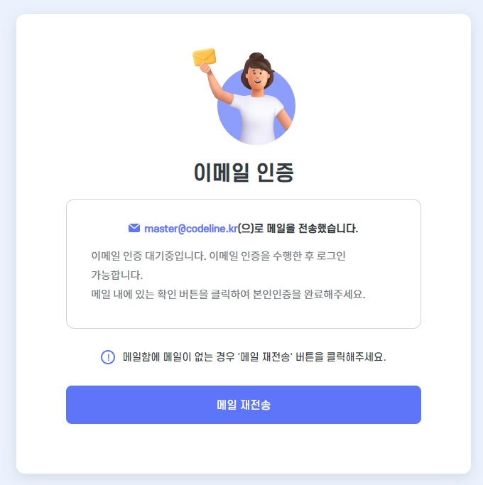 회원가입을 수행하면 다음과 같이 이메일 인증 페이지로 넘어갑니다.