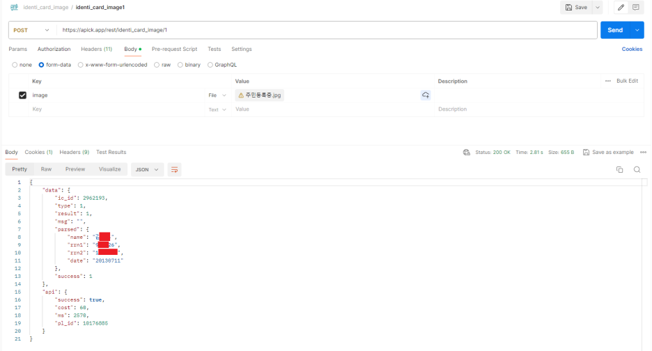 매개변수가 image 하나 뿐입니다. from-data 형식으로 촬영한 신분증 사진을 첨부하면 됩니다.