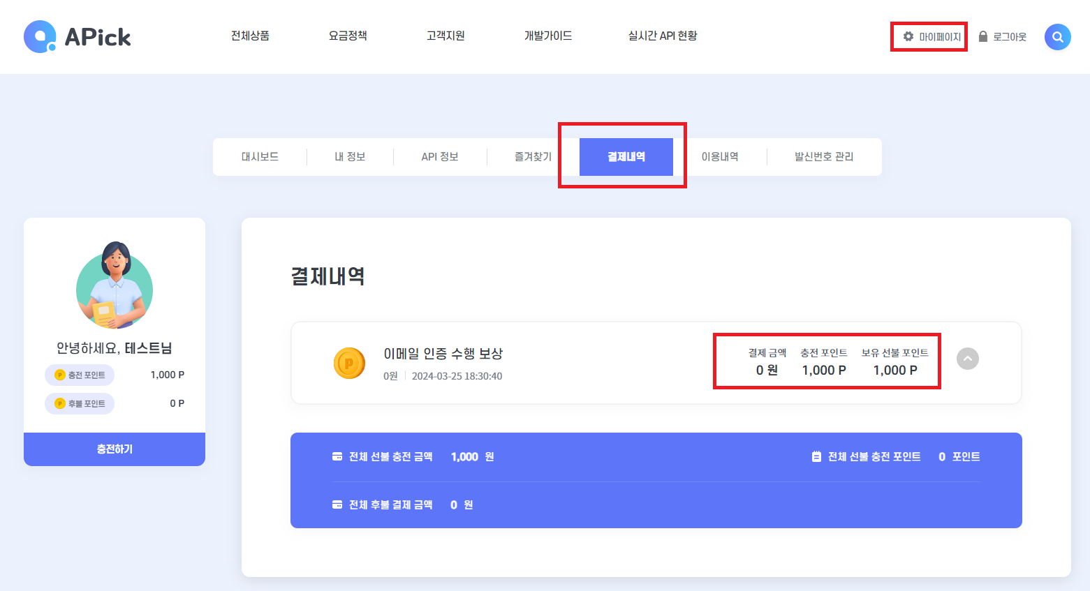 상단 메뉴의 "마이페이지" -> "결제내역" 으로 가면 1,000 포인트를 받았음을 확인할 수 있습니다.